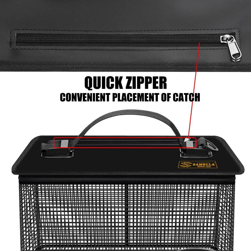 The floating lid design keeps the bucket upright at the surface, making it ideal for tying off beside a boat, jetty or kayak. A strong top zipper provides quick access, while the reinforced structure maintains shape during use. The breathable woven mesh promotes water circulation to help keep bait lively and fish fresh throughout your session.