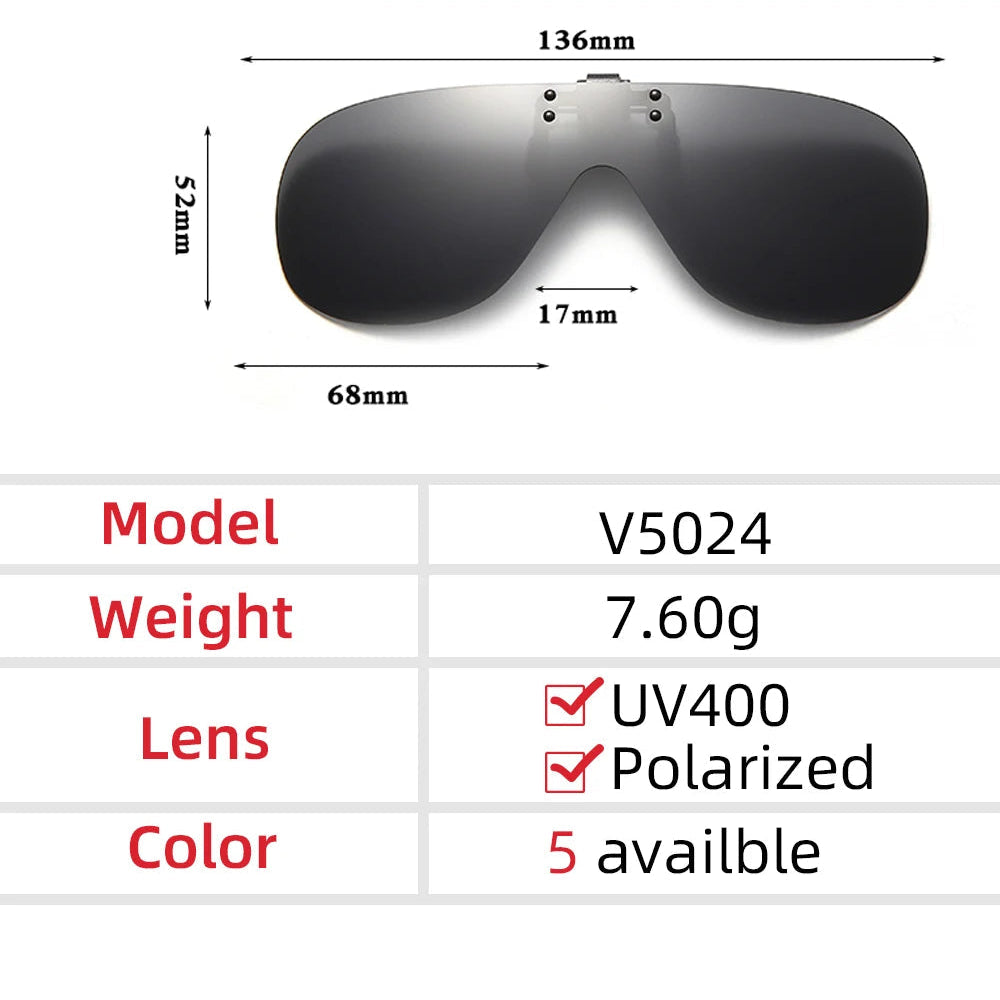Lightweight flip-up polarised clip-on sunglasses with UV400 lenses. Fit over prescription glasses for clear, glare-free driving and outdoor comfort.