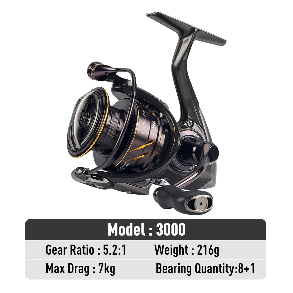 Ultralight spinning reel with 8+1 bearings, 8kg max drag, and 5.2:1 gear ratio. Smooth, precise, and built for finesse fishing across all conditions.