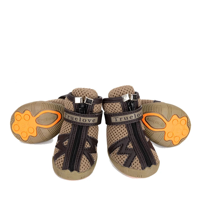 Breathable waterproof dog boots with rugged non-slip TPR soles, designed for outdoor protection from hot pavement, grass seeds, rough trails, and injured paw support.